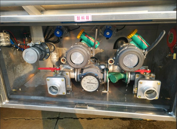 3.歐標下裝油系統:氣動海底閥(緊急切斷裝置)、廢油氣回收系統、防溢流系統、API閥門(下裝油口,配圖如下)、變徑接頭、邊板閥、油耗顯示器、靜電卷盤。